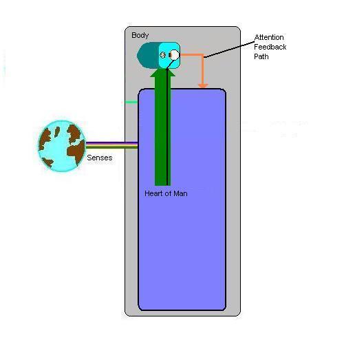 Note that all the sensations, including the body sense, is routed into the heart, which performs a huge amount of pre-processing of the signals. This is the modern contribution to the "Heart of Man" model. These resultant thoughts, including thoughts that generates the illusion of having the sense of taste, touch, sight, smell, and hearing, are thrown up into the part of the brain that we would call the "conscious" mind via what I call "the bitstream" (the green arrow), but which one could call the "display" portion of the mind. It is like a crt display. The "eye" in the model is "us", the "I" of the person. The "I" perceives the thoughts on the display, and chooses to focus on one of the possible thoughts being presented. This choice is fed back into the heart, which uses that feedback to throw "related" thoughts up to the "display" via "the bitstream". (The analogy of the display is a bit strained: it is more like a three dimensional stage on which the "I" is an actor.)